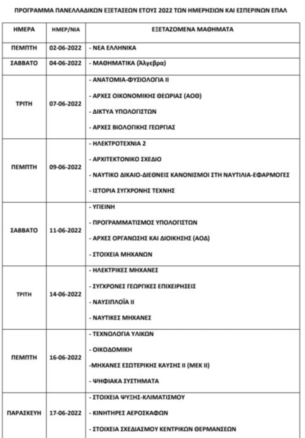 - Έναρξη πανελλαδικών εξετάσεων ημερήσιων και εσπερινών επαγγελματικών λυκείων: 2 Ιουνίου 2022.