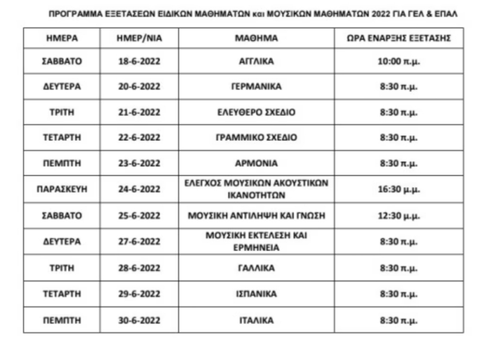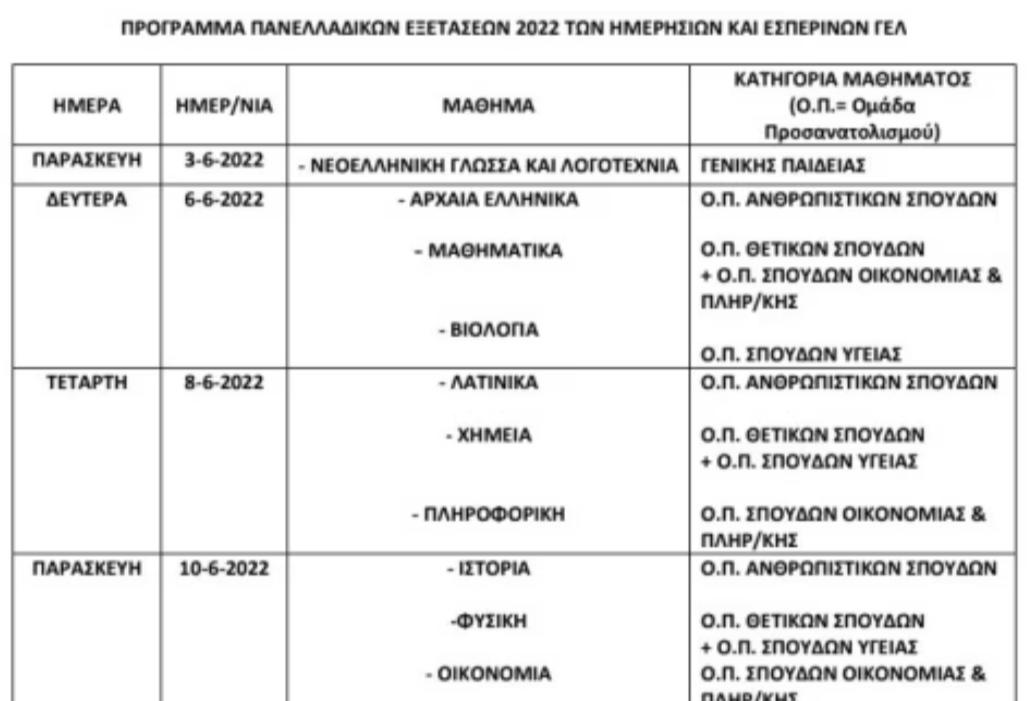 Δείτε το πρόγραμμα των Πανελλαδικών Εξετάσεων 2022 σε ΓΕΛ, ΕΠΑΛ και Μουσικά σχολεία: