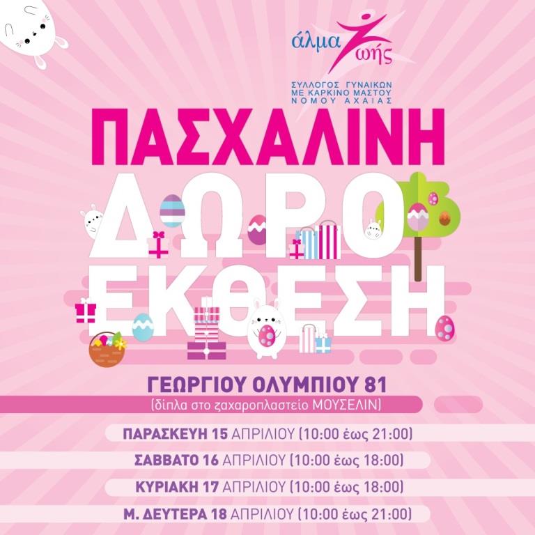 Ο Σύλλογος Γυναικών με Καρκίνο Μαστού «ΑΛΜΑ ΖΩΗΣ» Ν. Αχαΐας διοργανώνει Πασχαλινή Δωροέκθεση από 15 έως και 18 Απριλίου 2022, με λαμπάδες, γλυκά, κουλουράκια και πολλά δώρα που προσέφεραν με πολύ αγάπη μέλη και φίλοι του Συλλόγου, για να διατεθούν προς ενίσχυση του έργου και των σκοπών του.