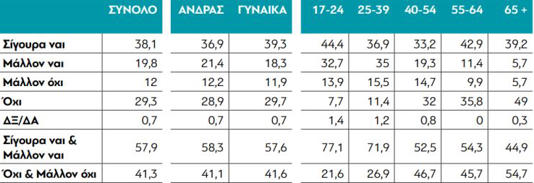 Το 77,1% των νέων ηλικίας 17-24 ετών απαντά ότι θα μετανάστευε στο εξωτερικό. Το 44,4% απαντά «σίγουρα ΝΑΙ» και το 32,7% «Μάλλον ΝΑΙ». Όχι και μάλλον όχι απαντά μόλις το 21,6% των ερωτηθέντων.