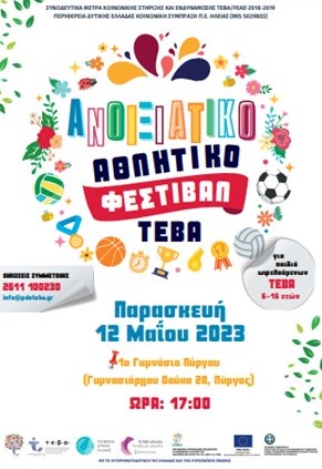 Η Περιφέρεια Δυτικής Ελλάδας σας προσκαλεί σε ένα Ανοιξιάτικο Αθλητικό Φεστιβάλ για μικρούς και μεγάλους, ωφελούμενους του ΤΕΒΑ ΚΣ Περιφερειακής Ενότητας Ηλείας. Δίνουμε ραντεβού την Παρασκευή 12 Μαΐου 2023, ώρα προσέλευσης στις 05:00 μ.μ. στο 1ο Γυμνάσιο Πύργου (Γυμνασιάρχου Δούκα 20), για να τρέξουμε, να παίξουμε, να μάθουμε, να συνεργαστούμε, να δημιουργήσουμε και να διασκεδάσουμε.