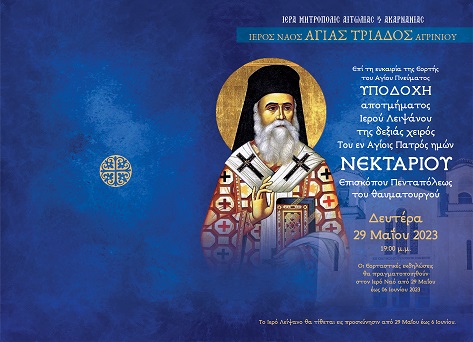 Την Δευτέρα 29 Μαΐου 2023 και ώρα 19:00’ θα πραγματοποιηθεί η υποδοχή αποτμήματος της δεξιάς χειρός, του Ιερού Λειψάνου του Αγίου Νεκταρίου, Επισκόπου Πενταπόλεως, του Θαυματουργού. Το Ιερό Λείψανο θα υποδεχθεί ο Σεβασμιώτατος Μητροπολίτης Αιτωλίας και Ακαρνανίας κ. Δαμασκηνός και θα ακολουθήσει Αρχιερατική Δοξολογία και Αρχιερατικός Εσπερινός, χοροστατούντος του Σεβασμιώτατου.