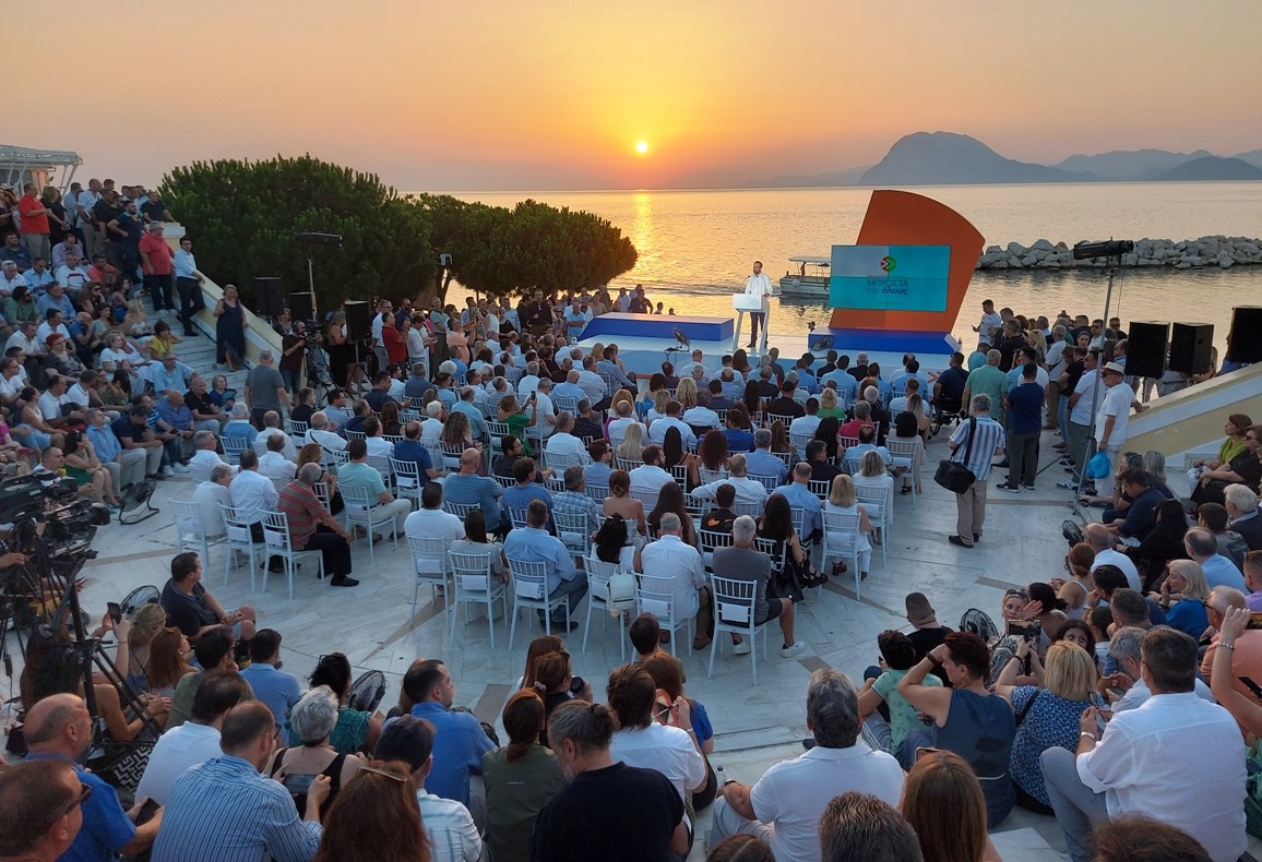 Η εκδήλωση, που παράλληλα ήταν και η εναρκτήρια ενόψει των Περιφερειακών Εκλογών του Οκτωβρίου, πραγματοποιήθηκε στον κατάμεστο χώρο της μαρίνας της Πάτρας, με «μέτωπο» προς τον Πατραϊκό Κόλπο και το Ιόνιο, αλλά και φόντο τον Κορινθιακό Κόλπο, δηλαδή τους ορίζοντες που εμπερικλείουν τη Δυτική Ελλάδα στο σύνολό της.