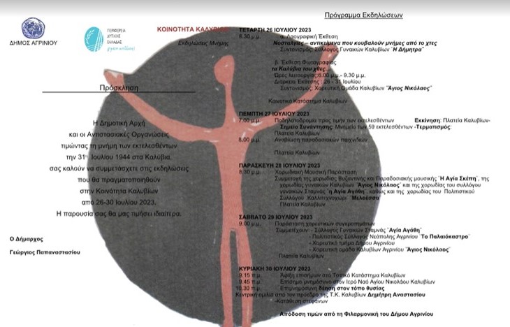 Ο Δήμος Αγρινίου, η Κοινότητα Καλυβίων και η Περιφέρεια Δυτικής Ελλάδας τιμώντας τη μνήμη των πατριωτών που εκτελέσθηκαν την 31η Ιουλίου 1944 στη Σιδηροδρομική γραμμή Αγρινίου-Κρυονερίου διοργανώνουν εκδηλώσεις από την Τετάρτη 26 Ιουλίου έως την Κυριακή 30 Ιουλίου.