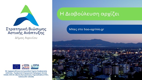 Στο πλαίσιο της συνδιαμόρφωσης για τη νέα Στρατηγική Βιώσιμης Αστικής Ανάπτυξης για την προγραμματική περίοδο 2021–2027, ο Δήμος Αγρινίου προσκαλεί όλους τους ενδιαφερόμενους πολίτες, επιχειρήσεις και φορείς να συμμετέχουν με την υποβολή προτάσεων και παρατηρήσεων.