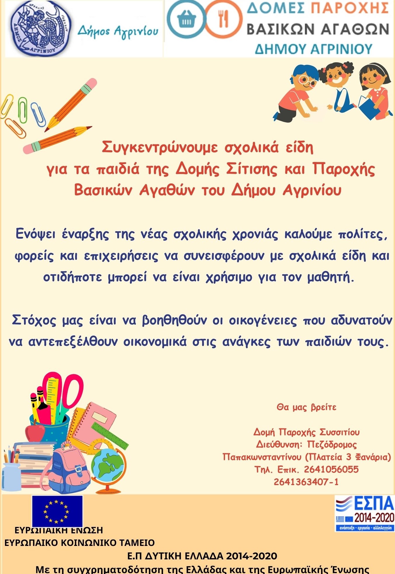 Η «Δομή Σίτισης και Παροχής Βασικών Αγαθών» του Δήμου Αγρινίου, αντιλαμβανόμενη τις ανάγκες των οικογενειών, συγκεντρώνει σχολικά είδη για τα παιδιά των ωφελούμενων.