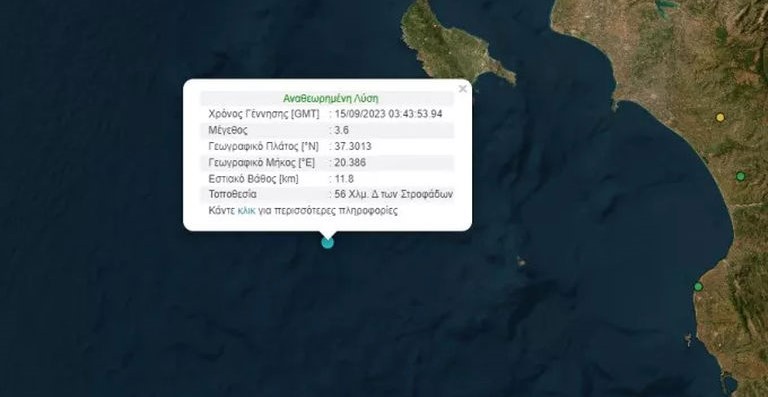 Σεισμός 3,6 βαθμών της Κλίμακας Ρίχτερ σημειώθηκε στις 5:43 το πρωί 56χλμ δυτικά των Στροφάδων, απέναντι από τις ακτές της Ζακύνθου.