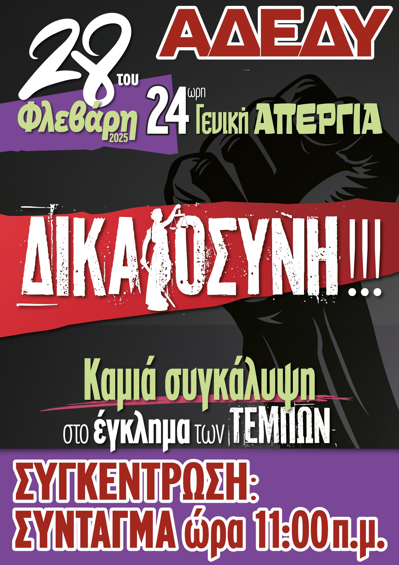 Στις 28/2, ημέρα που κλείνουν δύο χρόνια από την ημέρα που διαπράχθηκε το αποτρόπαιο έγκλημα στα Τέμπη η ΑΔΕΔΥ, δεκάδες ομοσπονδίες του ιδιωτικού τομέα και εργατικά κέντρα σε όλη την Ελλάδα έχουν κηρύξει απεργία.