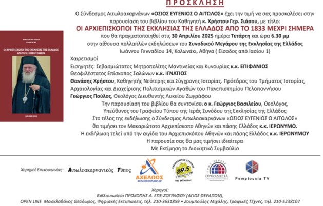 Παρουσίαση του βιβλίου του Καθηγητή κ. Χρήστου Γερ. Σιάσου με τίτλο: ΟΙ ΑΡΧΙΕΠΙΣΚΟΠΟΙ ΤΗΣ ΕΚΚΛΗΣΙΑΣ ΤΗΣ ΕΛΛΑΔΟΣ ΑΠΟ ΤΟ 1833 ΜΕΧΡΙ ΣΗΜΕΡΑ 30 ΑΠΡΙΛΙΟΥ 2025 ΗΜΕΡΑ ΤΕΤΑΡΤΗ ΩΡΑ 6.30 ΜΜ