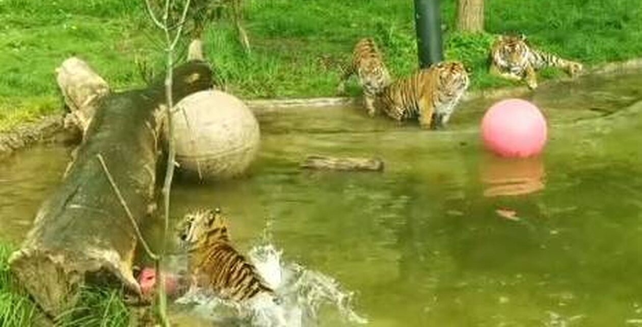 Όπως φαίνεται και στο βίντεο οι νεαρές τίγρεις είναι αρχικά διστακτικές. Οι άνθρωποι, βέβαια, του Ζωολογικού Κήπου είχαν τοποθετήσει πλαστικές μπάλες στη λίμνη.
