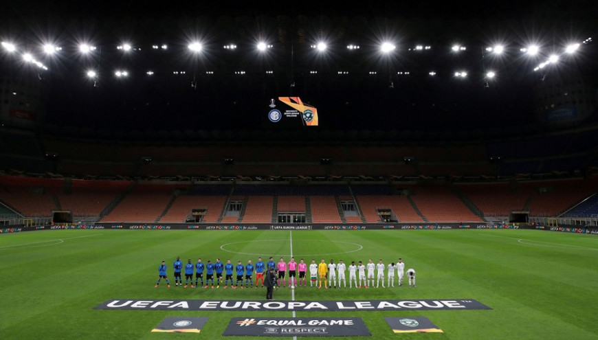 Οι παίκτες της Inter Milan παρατάσσονται απέναντι στην εντεκάδα της Ludogorets για το Europa League. Ο αγώνας έγινε σε ένα άδειο Σαν Σίρο, υπό τον φόβο της εξάπλωσης του κοροναϊού (Emilio Andreol / Reuters)