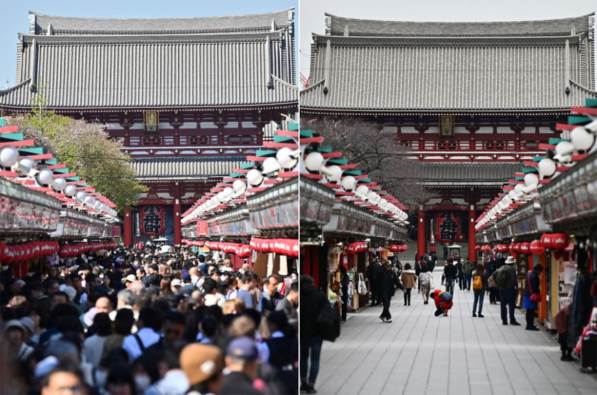 Ο προαύλιος χώρος του ναού Sensoji στο Τόκιο. Αριστερά στις 16 Απριλίου του 2019, δεξιά στις 9 Μαρτίου του 2020 (Charly Triballeau / AFP / Getty)