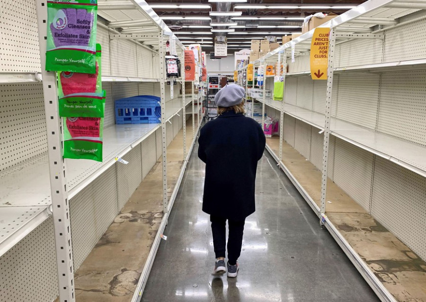 Ένας πελάτης περπατά ανάμεσα σε άδεια ράφια, που λίγες ημέρες νωρίτερα ήταν γεμάτα με σαπούνια, καθαριστικά και χαρτιά υγείας στο Smart & Final, στο Glendale της Καλιφόρνια (Robyn Beck / AFP / Getty)