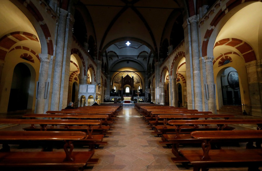 Η άδεια βασιλική του Sant'Ambrogio στο Μιλάνο. Ακολουθώντας τις οδηγίες των αρχών, η Επισκοπή αποφάσισε να αναστείλει τις λειτουργίες για να περιορίσει την εξάπλωση του ιού (Yara Nardi / Reuters)