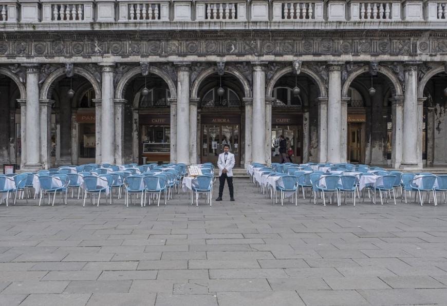 Ένας σερβιτόρος στέκεται στην άδεια πλατεία Piazza San Marco στη Βενετία (Stefano Mazzola / Awakening / Getty)