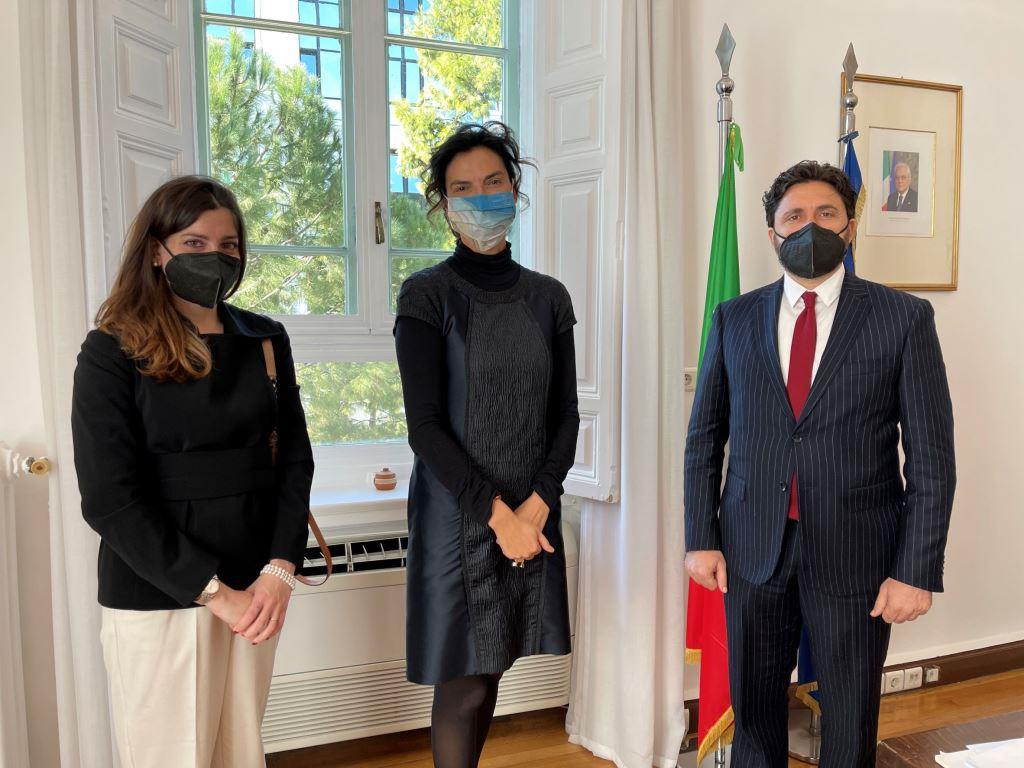 Την ίδια μέρα και αμέσως μετά την συνάντηση στο Προεδρικό Μέγαρο, ο Δήμαρχος τού Castrignano de’ Greci συνοδευόμενος από την σύζυγό του Caterina, πραγματοποίησε επίσκεψη γνωριμίας με την Πρέσβυ της Ιταλίας στην Ελλάδα, Patrizia Falcinelli, με την οποία είχε την ευκαιρία να συζητήσει θέματα συνεργασίας της Grecìa Salentina με την Ελλάδα.