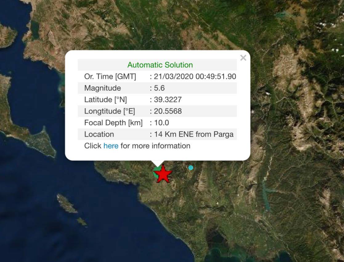Ισχυρή σεισμική δόνηση 5,6 βαθμών της κλίμακας Ρίχτερ σημειώθηκε στις 2:49 τα ξημερώματα, 14 χιλιόμετρα ανατολικά-βορειοανατολικά της Πάργας, αισθητή στις γύρω περιοχές.