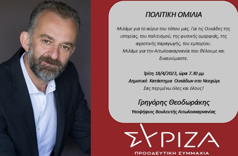 Ανοιχτή πολιτική ομιλία θα πραγματοποιήσει ο υποψήφιος Βουλευτής Αιτωλοακαρνανίας του ΣΥΡΙΖΑ-ΠΣ Γρηγόρης Θεοδωράκης την Τρίτη 18-04-2023 στις 07:30μμ στο Δημοτικό κατάστημα Οινιαδών στο Νεοχώρι.