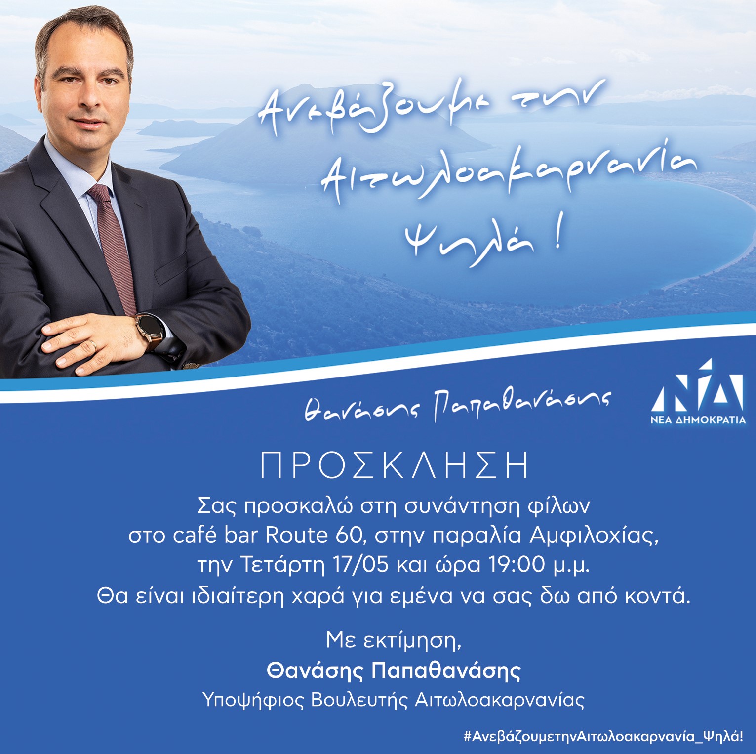 'Σας προσκαλώ στη συνάντηση φίλων στο café bar Route 60 στην παραλία Αμφιλοχίας την Τετάρτη 17/05 και ώρα 19:00 μ.μ. Θα είναι ιδιαίτερη χαρά για εμένα να σας δω από κοντά.'.
