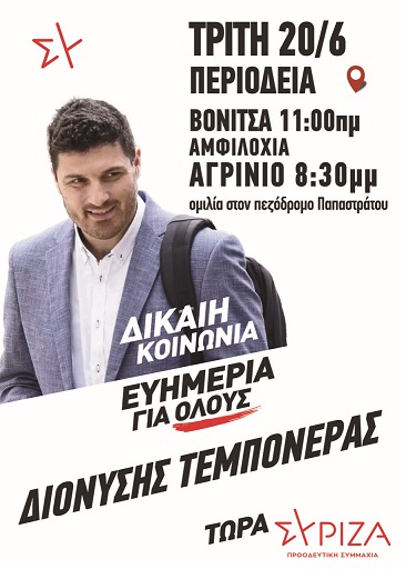 Ο ΣΥΡΙΖΑ-ΠΣ, στην τελική ευθεία προς την πιο κρίσιμη κάλπη της 25ης Ιουνίου, εντείνοντας την προσπάθεια για ενημέρωση των πολιτών της Αιτωλοακαρνανίας για το πλήρες πρόγραμμα μας για δίκαιη κοινωνία και ευημερία για όλους, υποδέχεται την Δευτέρα 19 Ιουνίου τον πρώην Υπουργό Νίκο Παππά και την Τρίτη 20 Ιουνίου τον επικεφαλής της εκλογικής επιτροπής, Διονύση Τεμπονέρα.