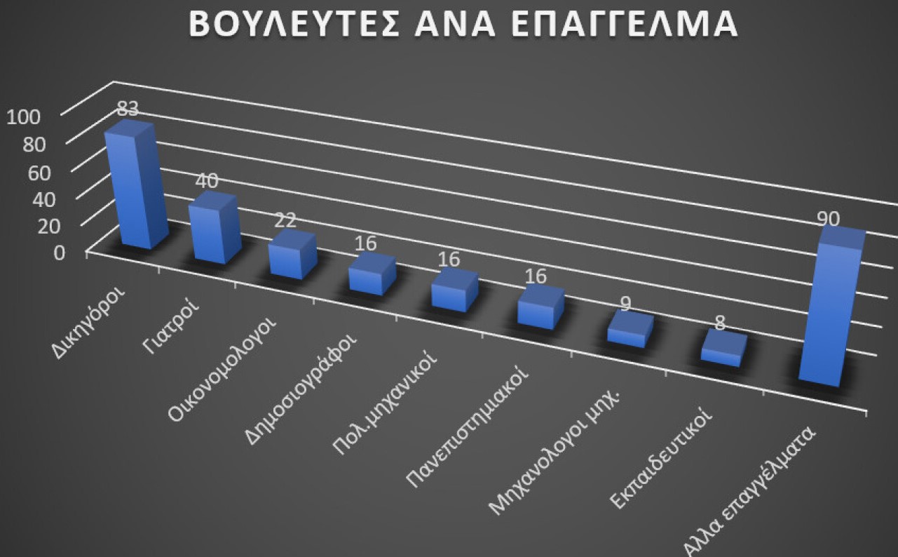Ενδιαφέρον συγκεντρώνει η ανάλυση της επαγγελματικής προέλευσης των βουλευτών η οποία δείχνει πως αν υπήρχε «κόμμα των δικηγόρων» θα ήταν το ισχυρότερο με 83 έδρες.