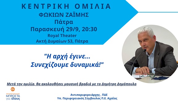 Με το σύνθημα «Η αρχή έγινε. Συνεχίζουμε δυναμικά» ο Αντιπεριφερειάρχης Επιχειρηματικότητας, Έρευνας και Καινοτομίας Φωκίων Ζαΐμης και εκ νέου υποψήφιος Περιφερειακός Σύμβουλος Αχαΐας με το συνδυασμό του Νεκτάριου Φαρμάκη «Μπροστά για όλους», προσκαλεί τους πολίτες της Αχαΐας στην κεντρική προεκλογική του ομιλία που θα πραγματοποιηθεί τη Παρασκευή 29 Σεπτεμβρίου και ώρα 20.30 στο Royal Theater (Ακτή Δυμαίων 53, Πάτρα)