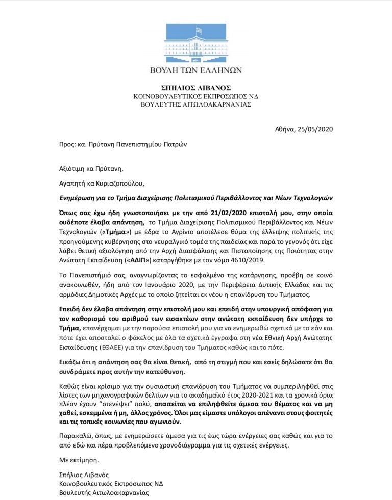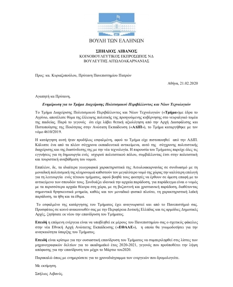 Καθώς είναι ιδιαίτερα κρίσιμο για την ουσιαστική επανίδρυση του Τμήματος να συμπεριληφθεί στις λίστες των μηχανογραφικών δελτίων για το ακαδημαϊκό έτος 2020- 2021 και τα χρονικά όρια πλέον έχουν περιοριστεί δραματικά, απευθύνω ύστατη έκκληση προς την Πρύτανη του Πανεπιστημίου Πατρών και όλους τους συναρμόδιους φορείς να σπεύσουν, για να μη χαθεί μια πολύτιμη ευκαιρία για την Αιτωλοακαρνανία, το Αγρίνιο και τους νέους μας, τους οποίους έχουμε ευθύνη να στηρίξουμε και να εφοδιάσουμε με τις απαραίτητες γνώσεις για το μέλλον».