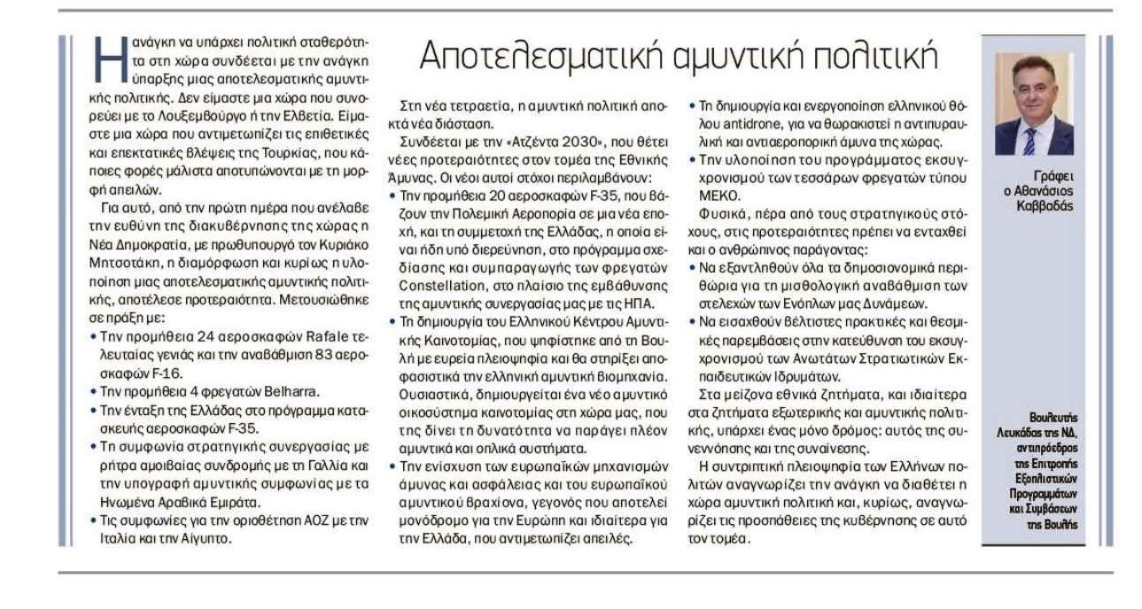 Για αυτό, από την πρώτη ημέρα που ανέλαβε την ευθύνη της διακυβέρνησης της χώρας η Νέα Δημοκρατία, με Πρωθυπουργό τον Κυριάκο Μητσοτάκη, η διαμόρφωση και κυρίως η υλοποίηση μιας αποτελεσματικής αμυντικής πολιτικής, αποτέλεσε προτεραιότητα. Μετουσιώθηκε σε πράξη με: