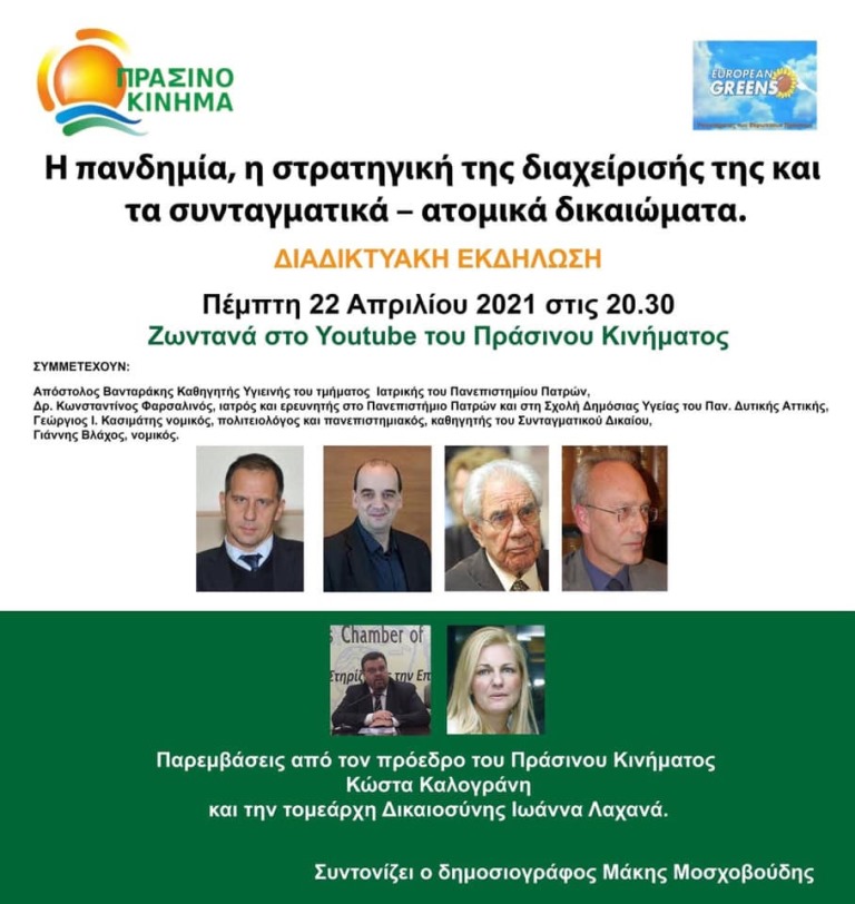 Το Πράσινο Κίνημα διοργανώνει μία άκρως επίκαιρη διαδικτυακή εκδήλωση με θέμα: “Η πανδημία, η στρατηγική της διαχείρισής της και τα συνταγματικά – ατομικά δικαιώματα”.