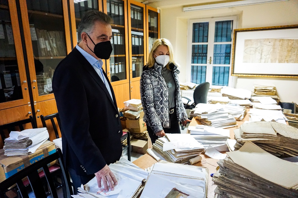 Κατόπιν, ο Βουλευτής επισκέφθηκε την Κεντρική Υπηρεσία των Γενικών Αρχείων του Κράτους στο Ψυχικό, όπου ενημέρωσε για τα ανωτέρω θέματα την Αναπληρώτρια Γενική Διευθύντρια, κ. Αμαλία Παππά και είχε την ευκαιρία να ξεναγηθεί στο Αρχειοφυλακείο και τους χώρους συντήρησης των εγγράφων του Αρχείου. Τέλος, η κ. Παππά παρέδωσε στον Βουλευτή 4 τόμους με επιλεγμένα ντοκουμέντα που φυλάσσονται στα κεντρικά αρχεία.