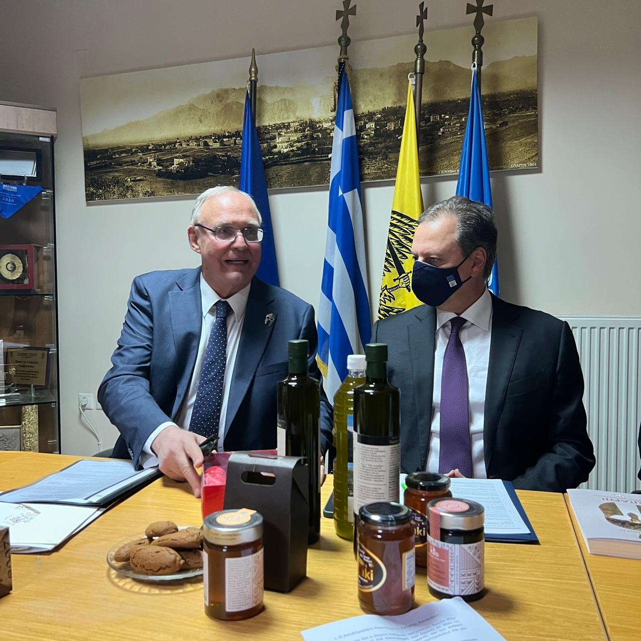 Πριν από τη σύσκεψη στα γραφεία της Αντιπεριφέρειας, ο κ. Λιβανός επισκέφθηκε τον Δήμαρχο Σπάρτης κ. Πέτρο Δούκα, ο οποίος τον ενημέρωσε για τις πρωτοβουλίες που αναπτύσσει ο Δήμος για προώθηση των ελληνικών προϊόντων και του ζήτησε να βελτιωθούν οι διαδικασίες για την οικοτεχνική παραγωγή.