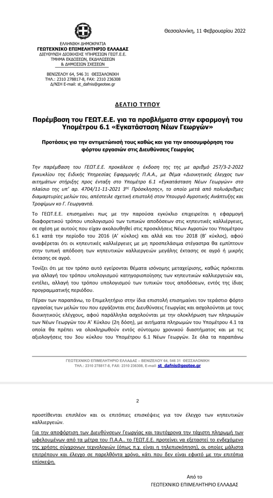 Με βάση τις δυο αυτές επιστολές, αναδεικνύεται η προχειρότητα με την οποία η ηγεσία του Υπουργείο Αγροτικής Ανάπτυξης και Τροφίμων επιχειρεί να επιλύσει την διαφοροποίηση των αποδόσεων των κηπευτικών καλλιεργειών υπό κάλυψη.