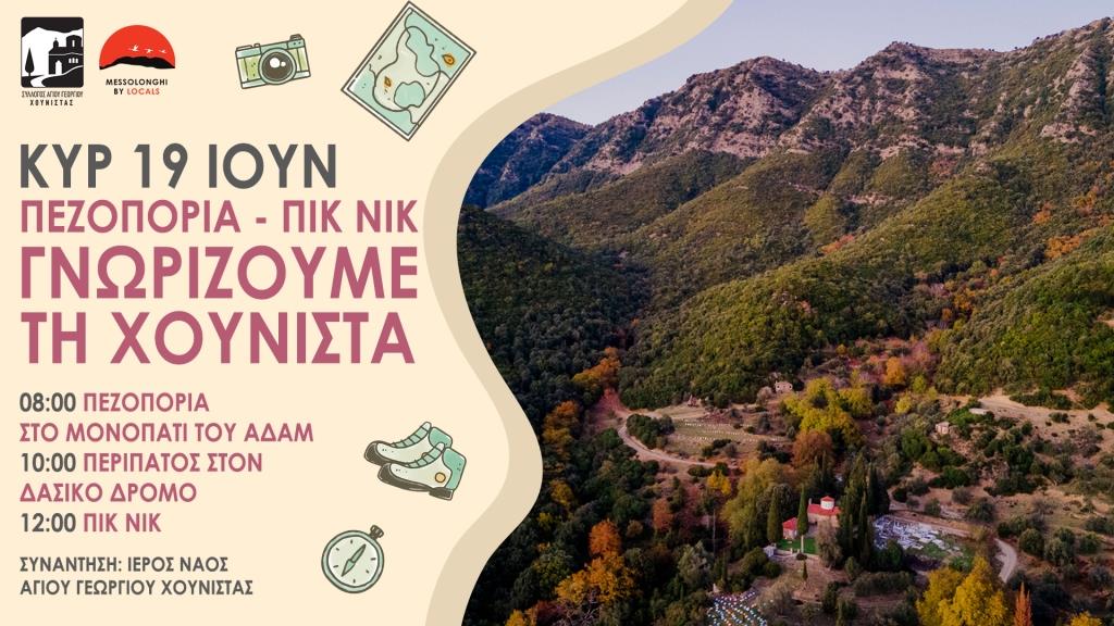Το πρωινό της Κυριακής 19 Ιουνίου είναι αφιερωμένο στη φύση καθώς ο Σύλλογος Αγίου Γεωργίου Χούνιστας και το ΜΕΣΟΛΟΓΓΙ ΤΩΝ ΝΤΟΠΙΩΝ-MESSOLONGHI BY LOCALS, διοργανώνουν δράση πεζοπορίας και πικ-νικ με στόχο να γνωρίσουμε την καταπράσινη Χούνιστα, να περπατήσουμε στον Αράκυνθο και να περάσουμε όμορφες στιγμές σε ένα άγνωστο αλλά πολύ σημαντικό σημείο της τοπικής μας ιστορίας.