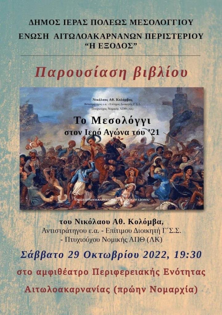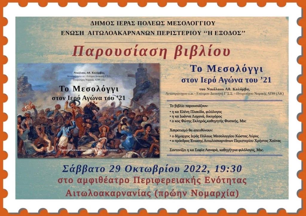 Η Ένωση Αιτωλοακαρνάνων Περιστερίου η «Έξοδος» σας προσκαλούν στην παρουσίαση του βιβλίου του Αντιστράτηγου Νικόλαου Κολόμβα "Το Μεσολόγγι στον Ιερό Αγώνα του 1821" που θα λάβει χώρα το Σάββατο 29 Οκτωβρίου 2022 και ώρα 19:30 στο αμφιθέατρο Περιφερειακής Ενότητας Αιτωλοακαρνανίας (πρώην Νομαρχία).