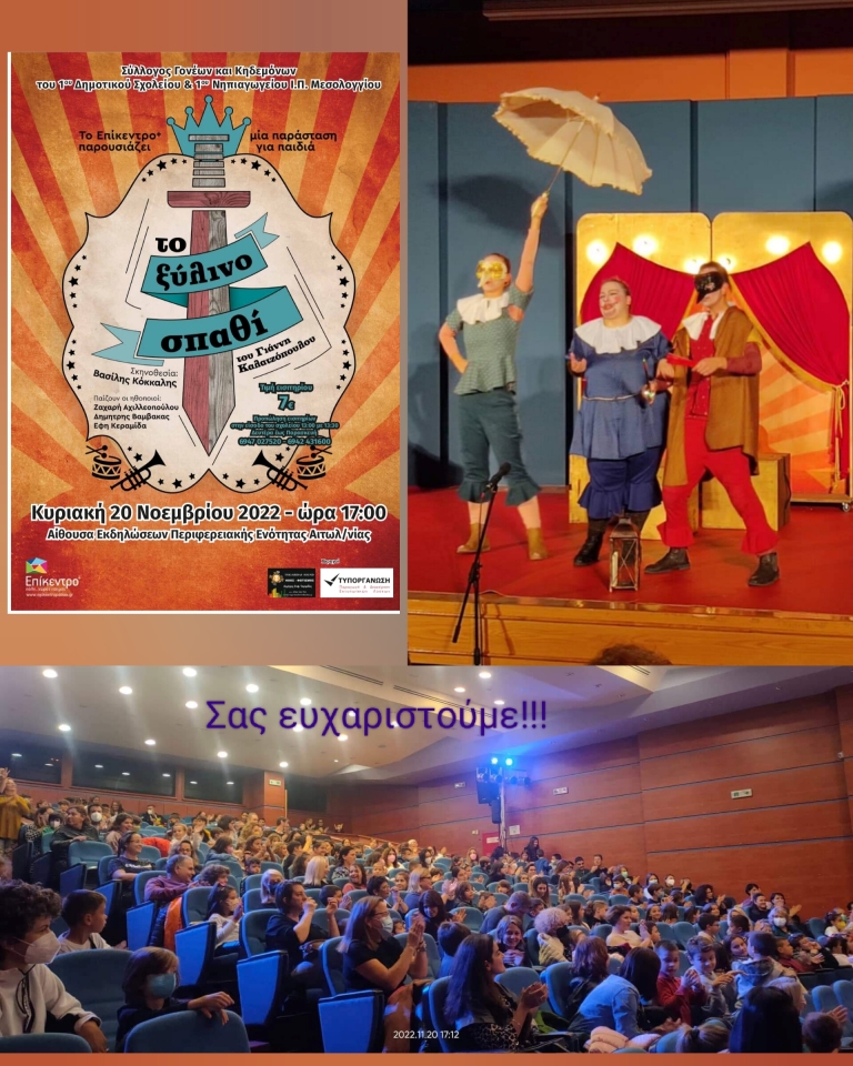 Την Κυριακή 20 Νοεμβρίου του 2022 στην κατάμεστη αίθουσα εκδηλώσεων της Περιφερειακής Ενότητας ο Σύλλογος Γονέων και Κηδεμόνων του 1ου Δημοτικού Σχολείου και 1ου Νηπιαγωγείου της Ι.Π. Μεσολογγίου φιλοξένησε την θεατρική παράσταση «το ξύλινο σπαθί». Επιλέξαμε ως πρώτη μας δράση να φέρουμε σε επαφή τα παιδιά μας με το θέατρο, καθώς πρόκειται για μια ζωντανή τέχνη η οποία έχει τη δύναμη να μεταδώσει στα παιδιά συγκλονιστικά συναισθήματα, γνώσεις, υψηλές αξίες και να ενεργοποιήσει τα πνευματικά τους χαρίσματα. Ήταν ο ιδανικός τρόπος να γιορτάσουμε τη Παγκόσμια Ημέρα του Παιδιού!