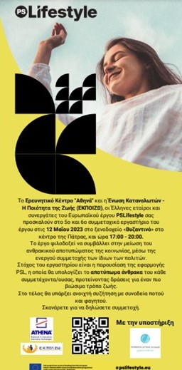 Το Ερευνητικό Κέντρο Αθηνά και η Ένωση Καταναλωτών - Η Ποιότητα της Ζωής (ΕΚΠΟΙΖΩ), οι Έλληνες εταίροι του Ευρωπαϊκού έργου  PSLifestyle  διοργανώνουν με την υποστήριξη της Περιφέρειας Δυτικής Ελλάδας το 5ο και 6ο συμμετοχικό εργαστήριο του έργου στις  12 Μαΐου 2023 στο ξενοδοχείο «Βυζαντινό» ,και ώρα 5.00μμ - 8.00μμ.