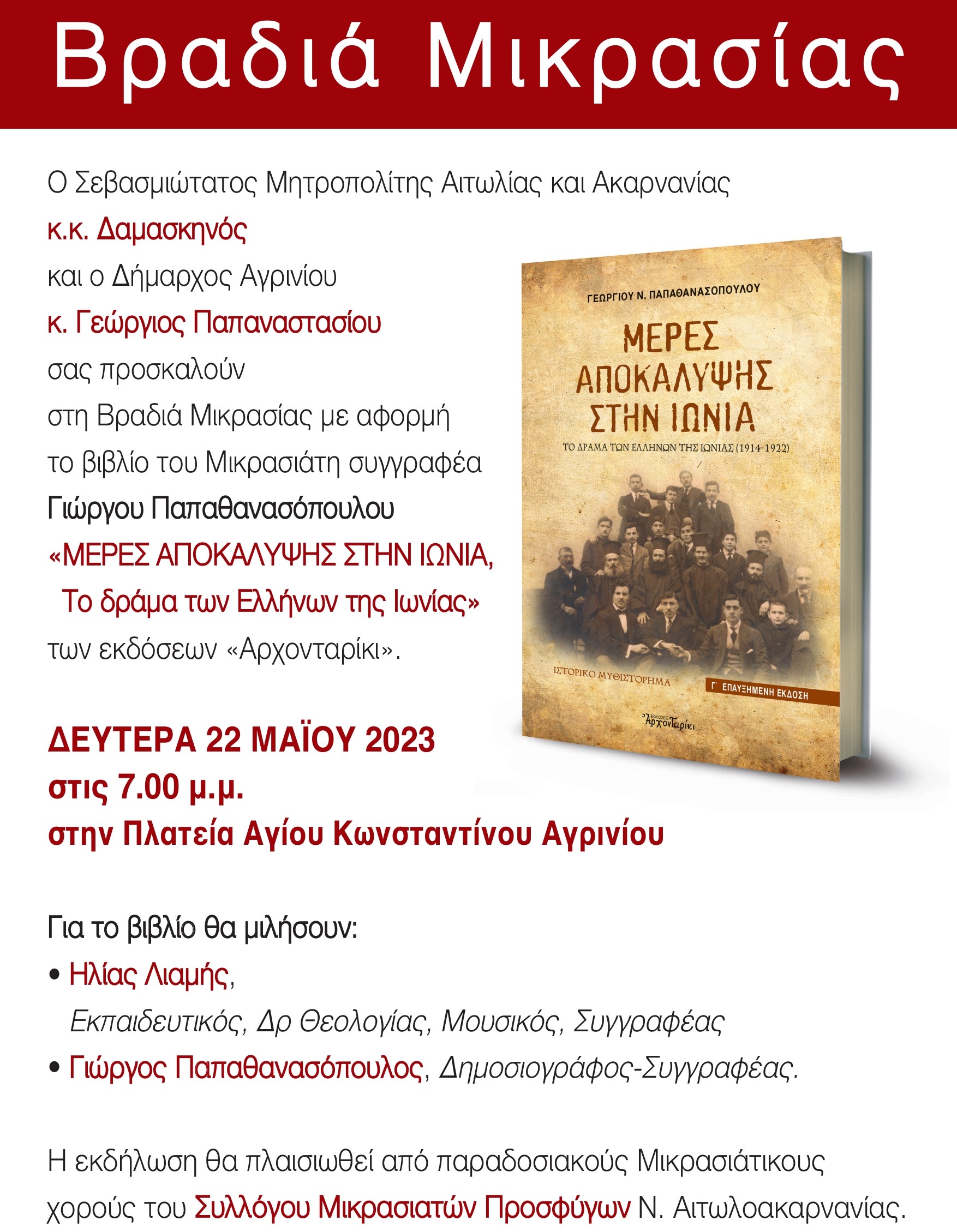 Θα παρουσιαστεί το βιβλίο του Μικρασιάτη Συγγραφέα κ. Γιώργου Παπαθανασόπουλου, με τίτλο «Μέρες αποκάλυψης στην Ιωνία - Το δράμα των Ελλήνων της Ιωνίας, 1914 – 1922», των εκδόσεων «Αρχονταρίκι».