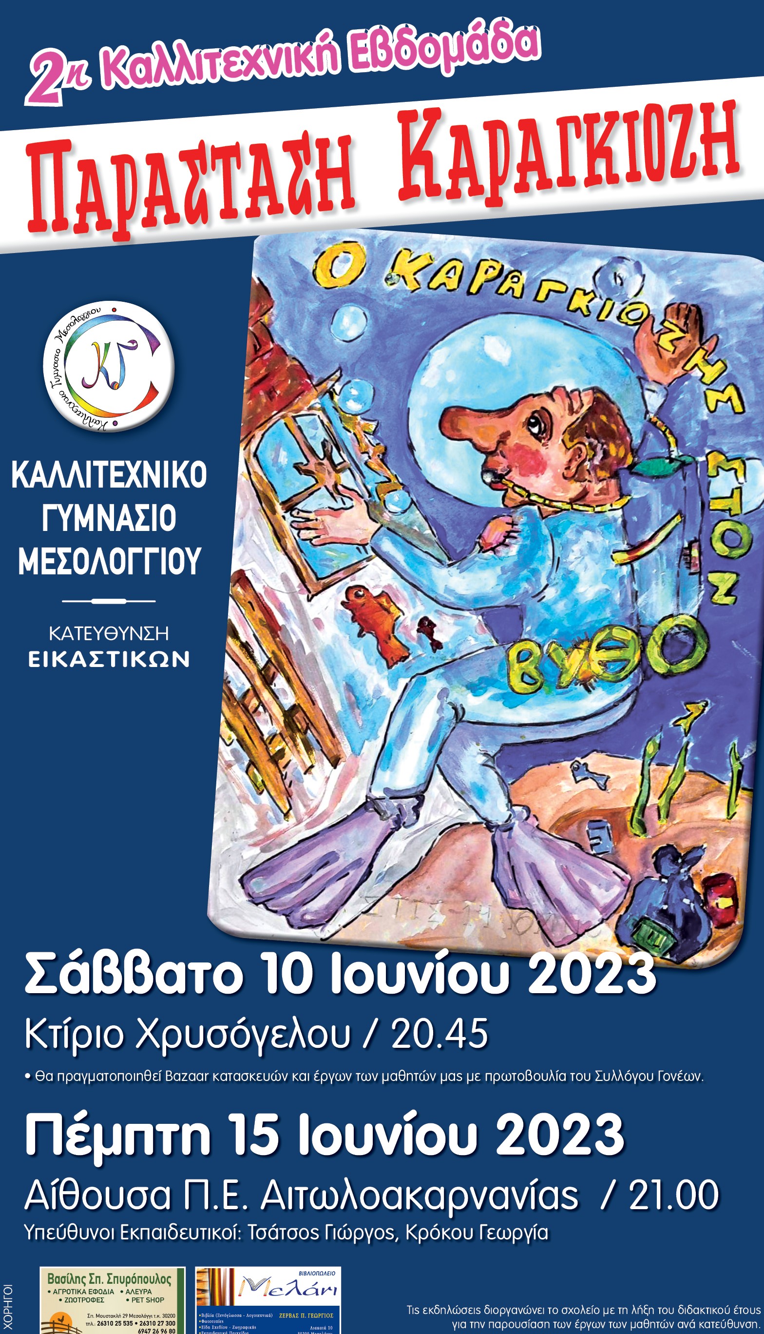 Το Καλλιτεχνικό Γυμνάσιο Μεσολογγίου σας προσκαλεί στις Καλλιτεχνικές Εκδηλώσεις που διοργανώνει το σχολείο με τη λήξη του διδακτικού έτους για την παρουσίαση των έργων των μαθητών ανά κατεύθυνση.