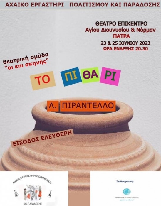 Το Πολιτιστικό Σωματείο Αχαϊκό Εργαστήρι στις 23 & 25 Ιουνίου 2023 σε συνδιοργάνωση με την Περιφέρεια Δυτικής Ελλάδος και ώρα 8.30μμ θα παρουσιάσει το θεατρικό έργο του Λουίτζι Πιραντέλλο "ΤΟ ΠΙΘΑΡΙ" στο θέατρο ΕΠΙΚΕΝΤΡΟ (Αγίου Διονυσίου και Νόρμαν) στην Πάτρα.