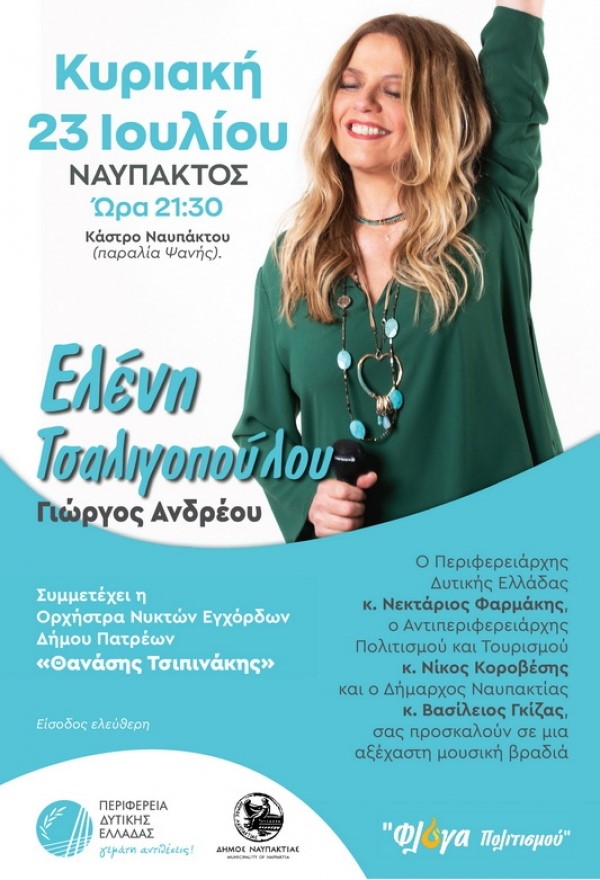 Ο Περιφερειάρχης Δυτικής Ελλάδας Νεκτάριος Φαρμάκης, ο Αντιπεριφερειάρχης Πολιτισμού και Τουρισμού Νικόλαος Κοροβέσης και ο Δήμαρχος Ναυπακτίας Βασίλειος Γκίζας, προσκαλούν το κοινό σε μία μοναδική μουσική βραδιά με την Ελένη Τσαλιγοπούλου, τον Γιώργο Ανδρέου και την Ορχήστρα Νυκτών Εγχόρδων «Θανάσης Τσιπινάκης» του Δήμου Πατρέων, η οποία θα πραγματοποιηθεί την Κυριακή 23 Ιουλίου 2023 και ώρα 21:30 στο Κάστρο Ναυπάκτου (παραλία Ψανής).