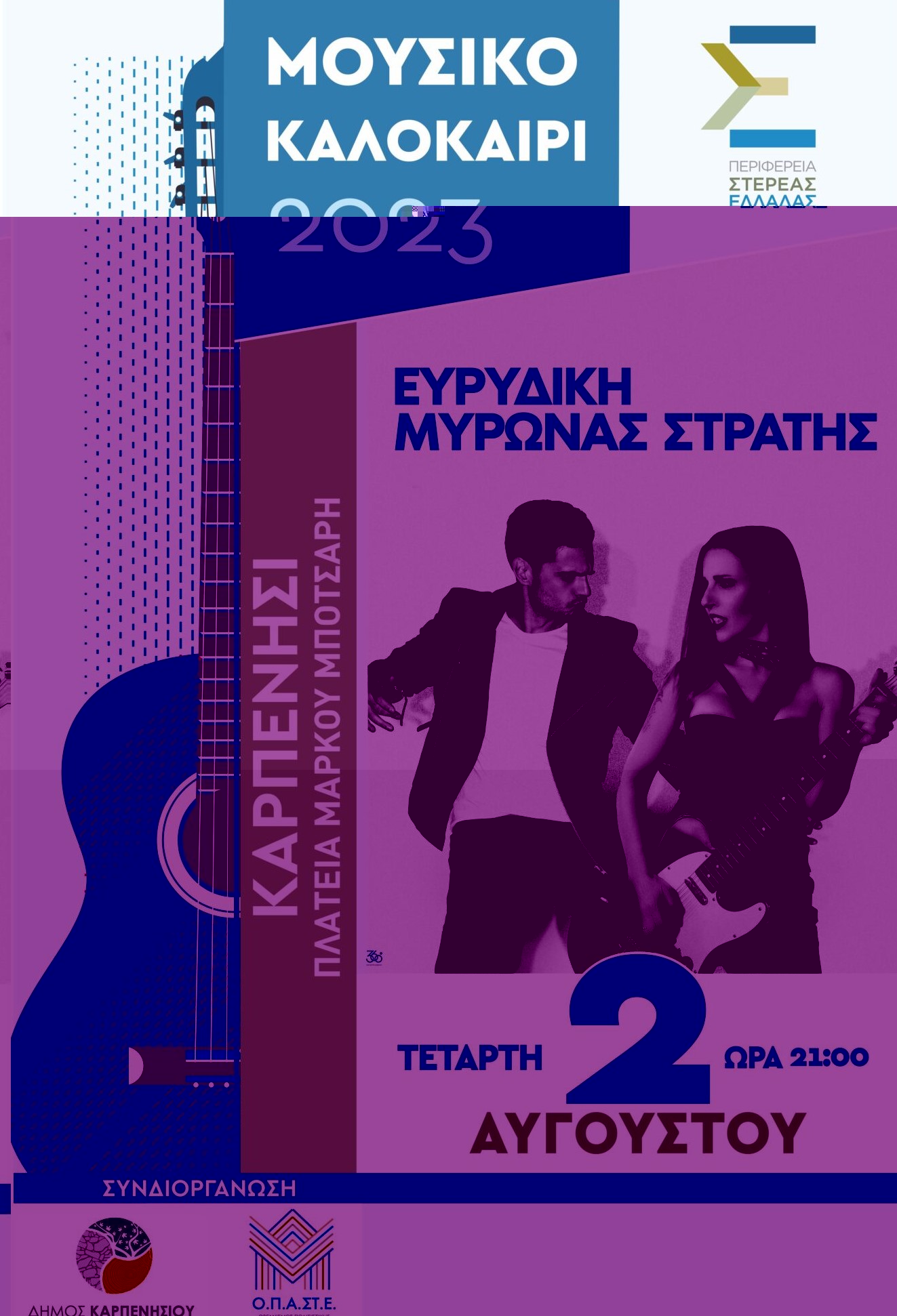 Tην Τετάρτη 2 Αυγούστου 2023 και ώρα 21.00, στην Πλατεία Μάρκου Μπότσαρη στο Καρπενήσι, όπου θα πραγματοποιηθεί συναυλία με την Ευρυδίκη και τον Μύρωνα Στρατή.