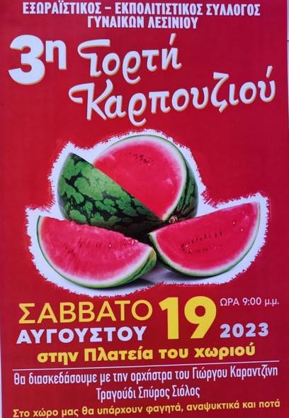 Το Σάββατο  19 Αυγούστου 2023, στις 21.00 μ.μ. θα πραγματοποιηθεί η 3η Γιορτή Καρπουζιού στην κεντρική πλατεία του Λεσινίου με την ορχήστρα του Γιώργου Καραντζίνη (τραγούδι ο Σπύρος Σιόλος).