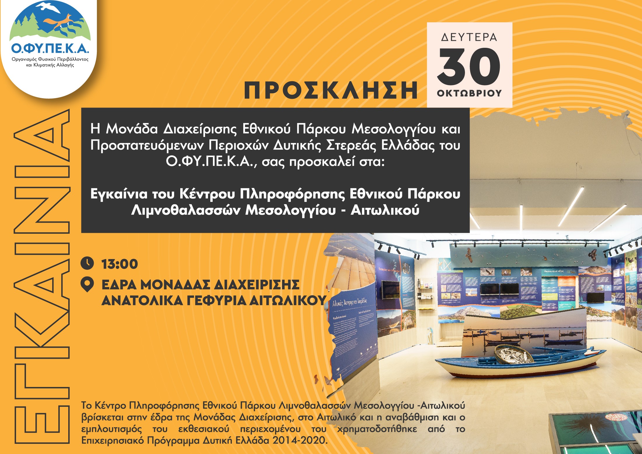 Η Μονάδα Διαχείρισης Εθνικού Πάρκου Μεσολογγίου & Προστατευόμενων Περιοχών Δυτικής Στερεάς Ελλάδας του Οργανισμού Φυσικού Περιβάλλοντος & Κλιματικής Αλλαγής (Ο.ΦΥ.ΠΕ.Κ.Α.) σας προσκαλεί στα εγκαίνια του Κέντρου Πληροφόρησης Εθνικού Πάρκου Λιμνοθαλασσών Μεσολογγίου – Αιτωλικού.