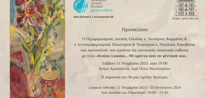 Η Περιφέρεια Δυτικής Ελλάδας και ο Αντιπεριφερειάρχης Πολιτισμού και Τουρισμού κ. Νικόλαος Κοροβέσης σας προσκαλούν στα εγκαίνια της επετειακής έκθεσης του καλλιτέχνη, Κώστα Λούστα, με τίτλο «KOSTAS LOYSTAS… 90 χρόνια από τη γέννησή του» στις 11 Νοεμβρίου 2023 και ώρα 7.00μ.μ, στο Κτίριο Χρυσόγελου Ι. Π. Μεσολογγίου, του τομέα Πολιτισμού ΠΔΕ. Η έκθεση θα φιλοξενηθεί στον εν λόγω χώρο από τις 11 Νοεμβρίου 2023 έως τις 26 Ιανουαρίου 2024.