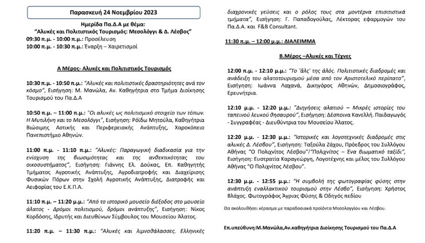 Tήν Παρασκευή 24 Νοεμβρίου 2023 θα πραγματοποιηθεί στο Πανεπιστήμιο Δυτικής Αττικής (Πα.Δ.Α.) η επιστημονική ημερίδα «Αλυκές και Πολιτιστικός Τουρισμός: Ι.Π Μεσολογγίου & Δ.Λέσβου», με Επιστημονική Υπεύθυνη την Μαρία Μανώλα, Aν.Καθηγήτρια του Τμήματος Διοίκησης Τουρισμού του Πα.Δ.Α.