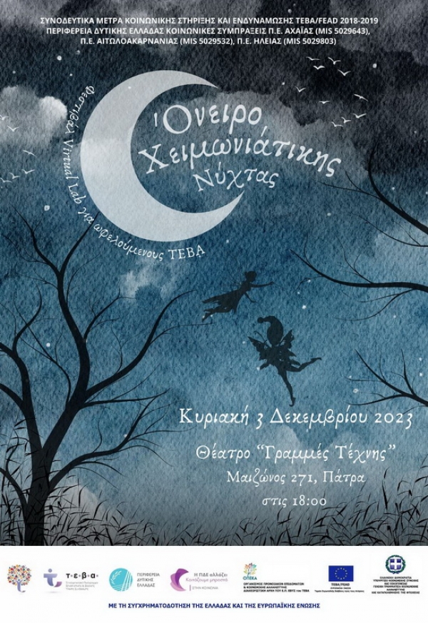 Η Περιφέρεια Δυτικής Ελλάδας διοργανώνει ένα γιορτινό και ξεχωριστό φεστιβάλ με τίτλο «Όνειρο Χειμωνιάτικης Νύχτας», που υλοποιείται στο πλαίσιο της δράσης Συνοδευτικών Μέτρων «Virtual Lab» και απευθύνεται σε ωφελούμενους ΤΕΒΑ και των τριών Κοινωνικών Συμπράξεων Κ.Σ. (Π.Ε. Αχαΐας, Π.Ε. Αιτ/νίας και Π.Ε. Ηλείας). Η δράση θα φιλοξενηθεί την Κυριακή 3 Δεκεμβρίου 2023, στο θέατρο Γραμμές Τέχνης, (Μαιζώνος 271, Πάτρα) στις 6:00 το απόγευμα και αποτελεί μια διαδραστική χαρούμενη εκδήλωση, στο πνεύμα των Χριστουγέννων.