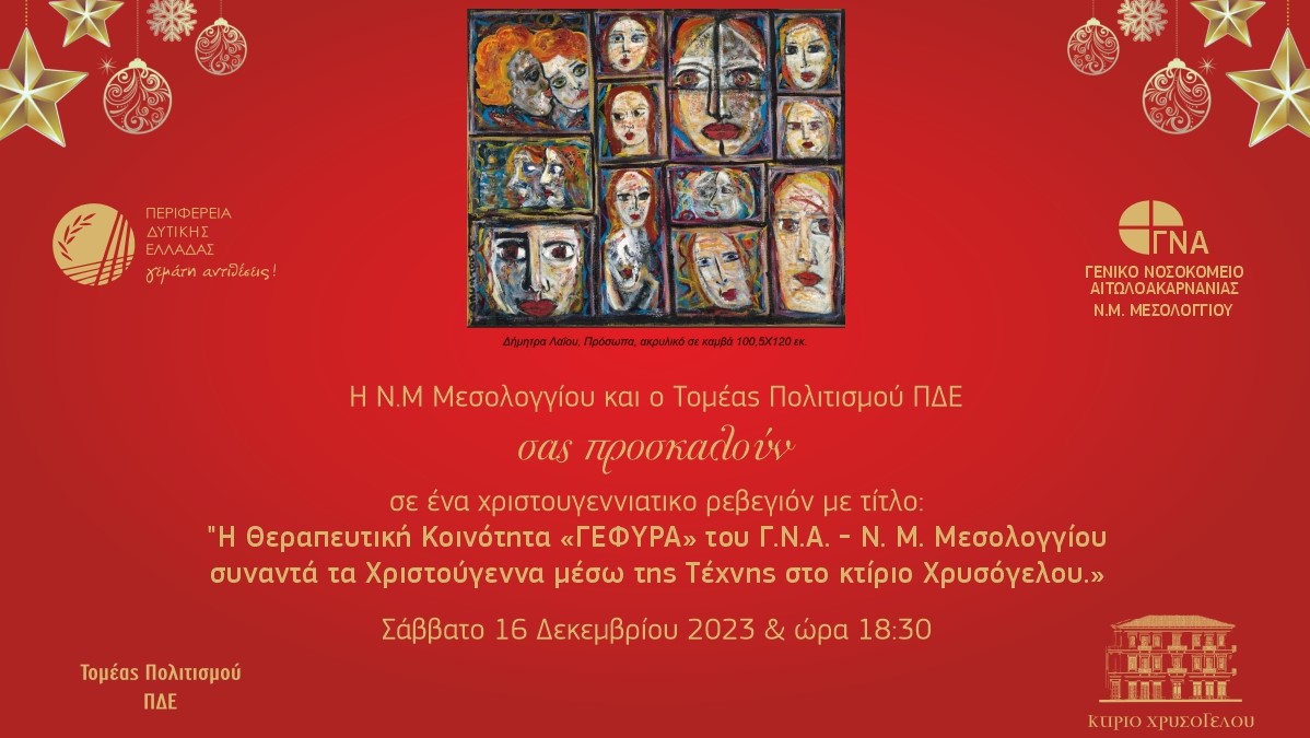 Ο Τομέας Πολιτισμού ΠΔΕ και η Ν.Μ Μεσολογγίου οργανώνουν χριστουγεννιάτικο ρεβεγιόν με τίτλο: "Η Θεραπευτική Κοινότητα «ΓΕΦΥΡΑ» του Αιτωλ/νίας – Ι.Π.Μεσολογγίου συναντά μέσω της Τέχνης τα Χριστούγεννα στο Κτίριο Χρυσόγελου" το Σάββατο στις 16 Δεκεμβρίου 2023 και ώρα 18:30.
