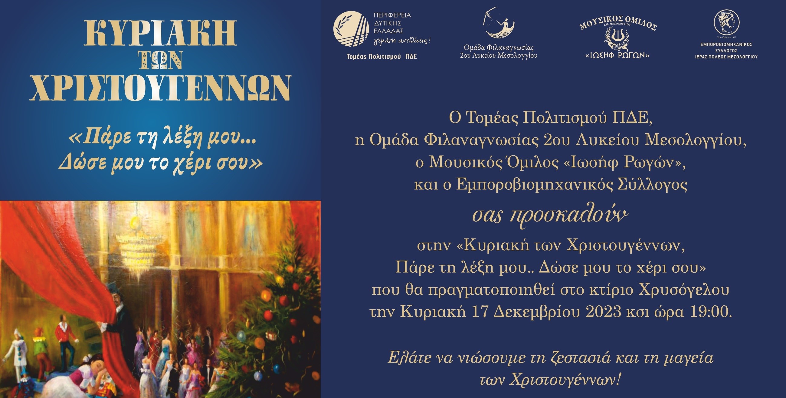 Ο Τομέας Πολιτισμού ΠΔΕ, η ομάδα Φιλαναγνωσίας του 2ου Λυκείου Ι. Π. Μεσολογγίου, ο ΜΟΜ Ιωσήφ Ρωγών και ο Εμποροβιομηχανικός Σύλλογος, σας προσκαλούν στην εκδήλωση με τίτλο: "Κυριακή των Χριστουγέννων. Πάρε τη λέξη μου …Δώσε μου το χέρι σου» στο Μεσολόγγι, στο Κτίριο Χρυσόγελου".