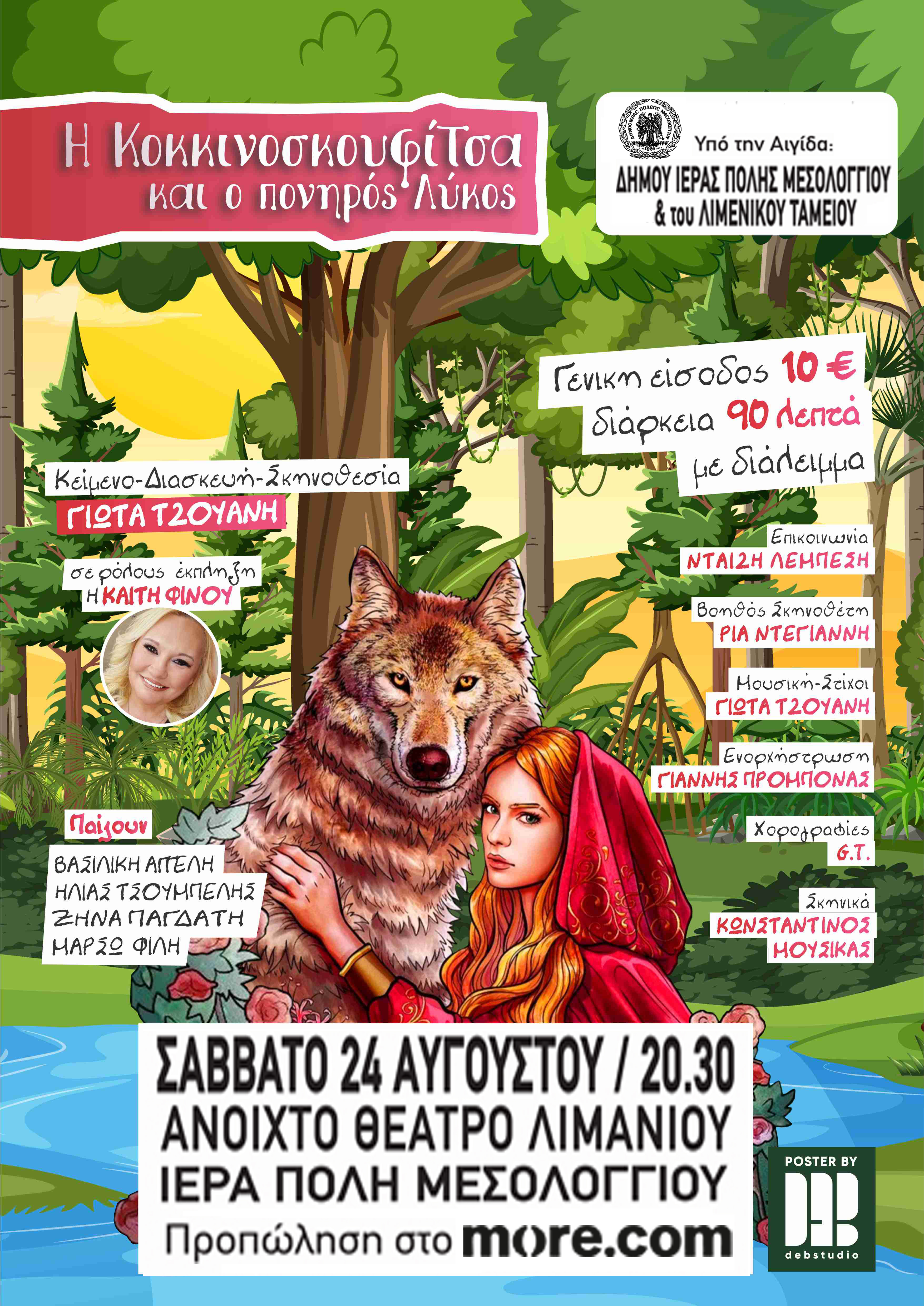 Ο Δήμος Ιερής Πόλης Μεσολογγίου και το Δημοτικό Λιμενικό Ταμείο σας προσκαλούν το Σάββατο, 24 Αυγούστου 2024 και ώρα 20:30 στην παράσταση «Η Κοκκινοσκουφίτσα και ο Πονηρός Λύκος» στο Ανοικτό Θέατρο Λιμανιού.