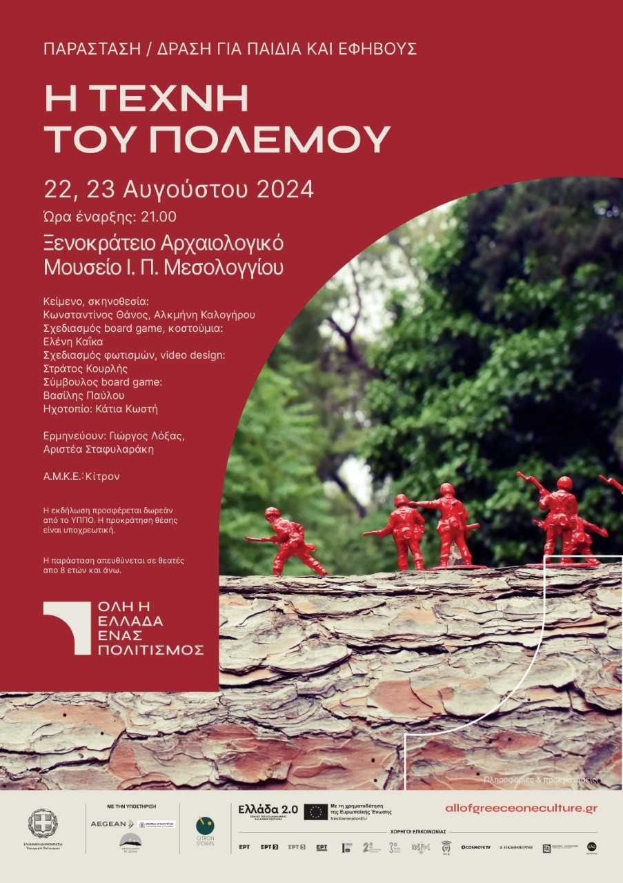 Ο πόλεμος αποτελεί την έσχατη μορφή σύγκρουσης μεταξύ αντιπάλων. Η παράσταση "Η τέχνη του πολέμου", σε κείμενο και σκηνοθεσία των Κωνσταντίνου Θάνου και Αλκμήνης Καλογήρου, αποτελεί μια αναπαράσταση μάχης πολέμου με τη μορφή επιτραπέζιου παιχνιδιού που απευθύνεται σε παιδιά και εφήβους.
